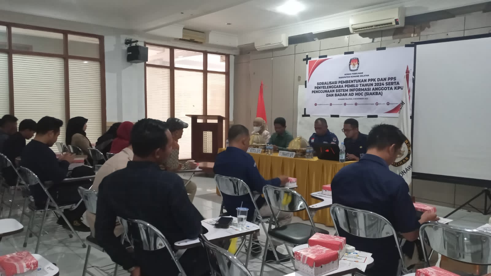 KONAWE SELATAN – Komisi Pemilihan Umum (KPU) Kabupaten Konawe Selatan (Konsel) Sulawesi Tenggara (Sultra) menggelar sosialisasi pembentukan Panitia Pemilihan Kecamatan (PPK) dan Panitia Pemungutan Suara (PPS) penyelenggara Pemilu tahun 2024 berbasis online melalui Aplikasi SIAKBA. Selasa 8 November 2022