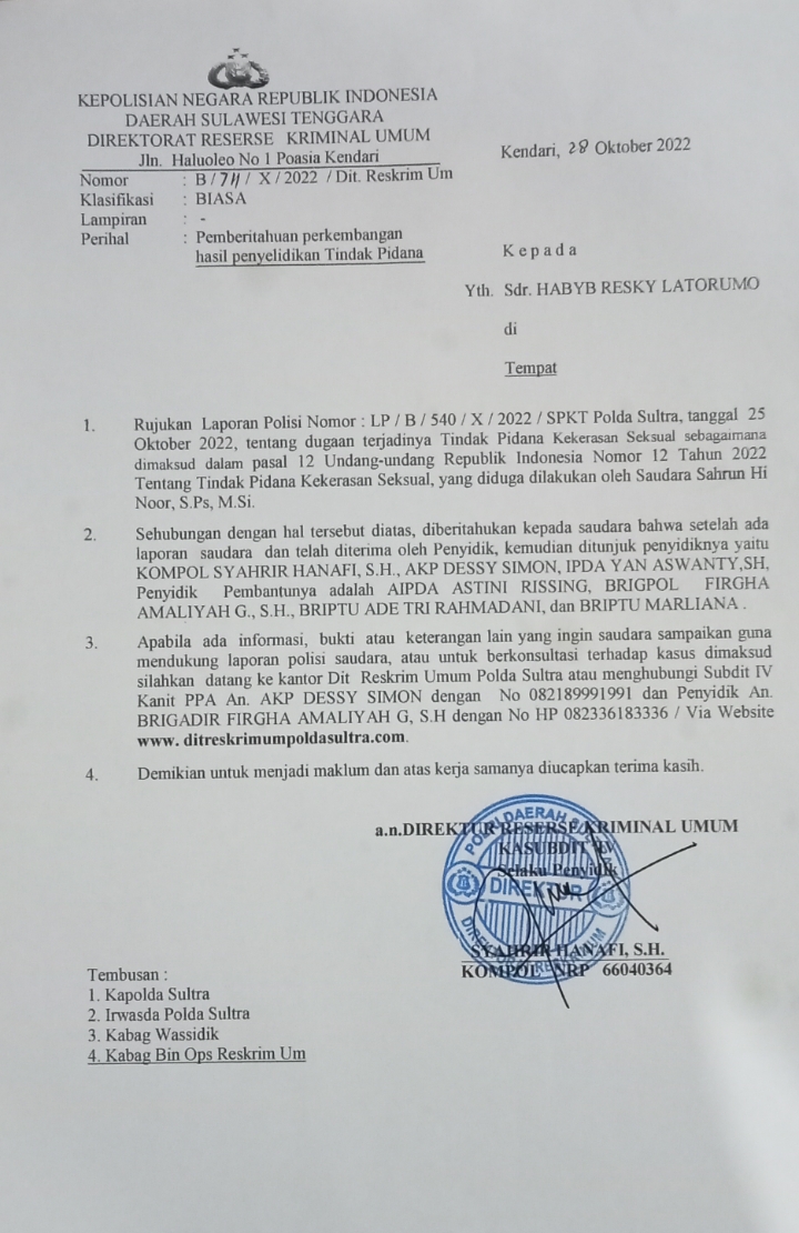 StoryNews.id, Kendari – Kasus kekerasan seksual yang diduga dilakukan seorang kepala sekolah dikonawe sudah dalam proses penyelidikan dipolda, laporan pengaduan pihak korban tertanggal 25 oktober 2022 yang diduga terjadi tindak pidana kekerasan seksual yang tertuang dalam pasal 12 undang undang republik indonesia no 12 tahun 2022 tetang pidana kekerasan seksual yang diduga dilakukan oknum SN
