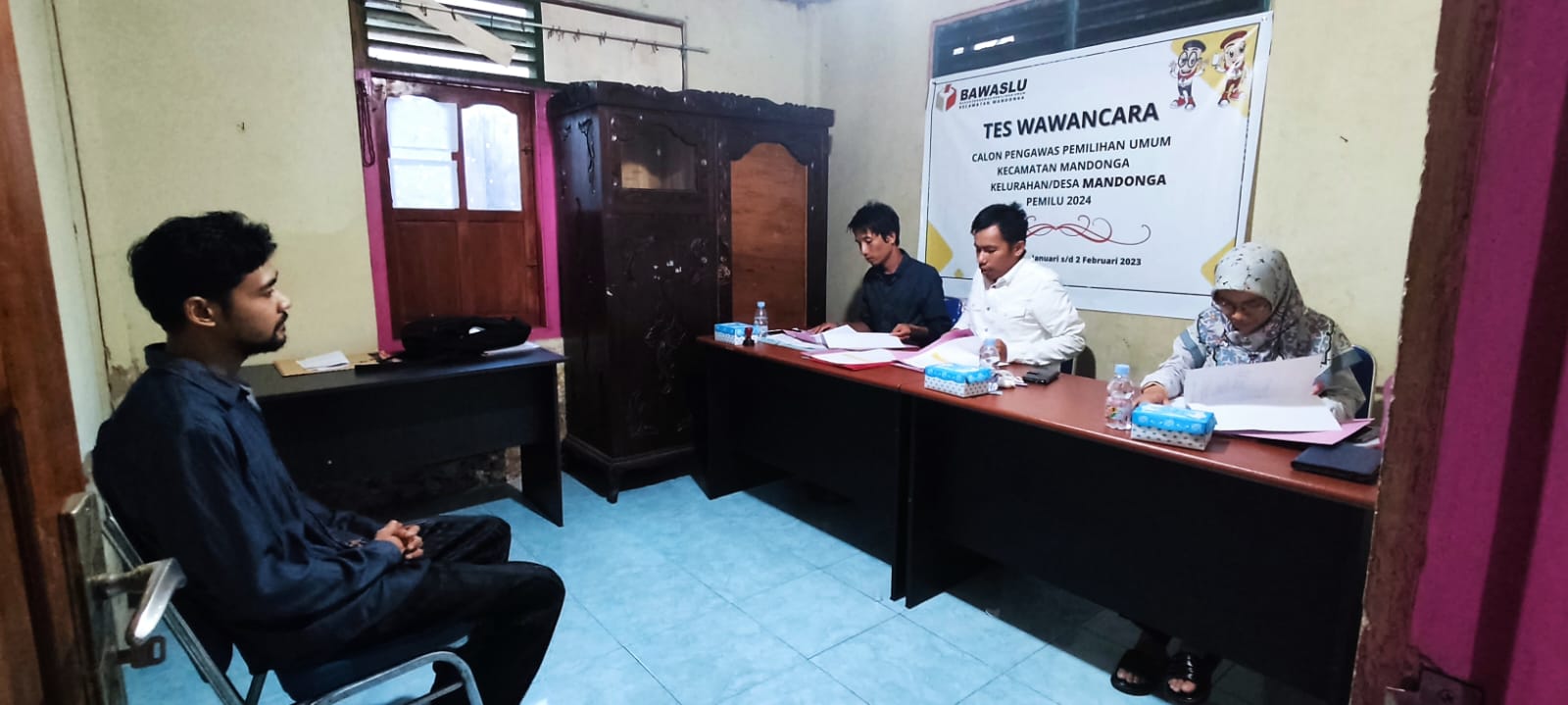 Sesuai Jadwal pelaksanaan tes wawancara calon panwas untuk kelurahan mulai dari tanggal 31 januari sampai tanggal 2 februari 2023 dari kelurahan dengan jumlah peserta 16 orang sekecamatan mandonga