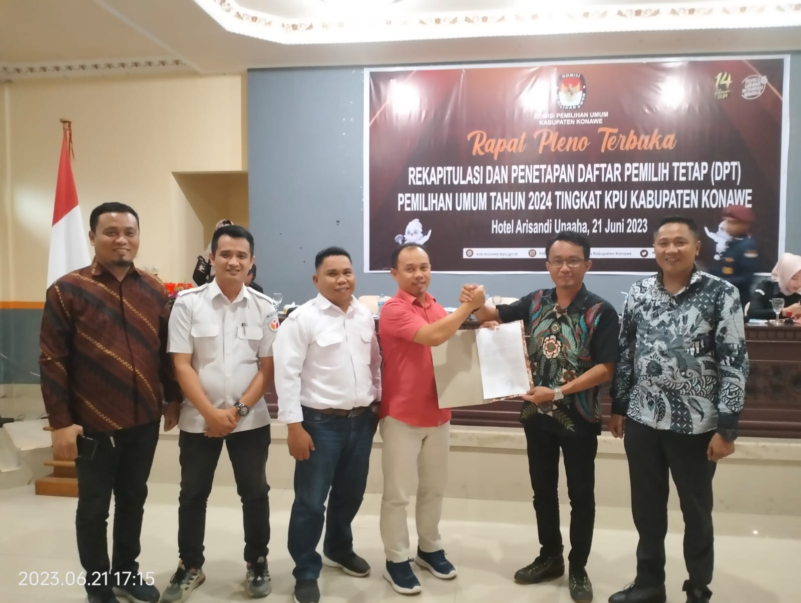 Dimana acara penetapan DPT Pemilu tahun 2024 ini, yang berlangsung dengan dirangkaian kegiatan rapat pleno terbuka yang digelar KPU Kabupaten Konawe di ruang Aula Hotel Arisandi Lantai dua, Jalan Konggoasa Nomor 48 kelurahan Arombu Kecamatan Unaaha, Rabu (21/6/2023 )